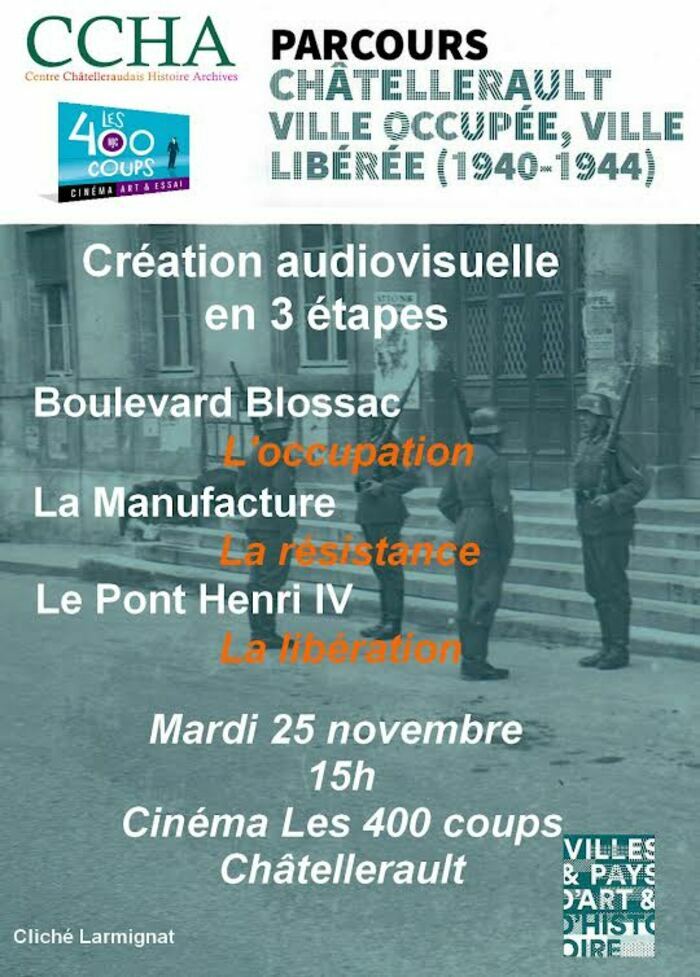 Cette création mène le spectateur dans trois lieux emblématiques : sur le boulevard Blossac occupé, à la manufacture, pôle de résistance, et sur le pont Henri IV pour célébrer la libération Elle accompagne un livret parcours Villes & Pays d’art et d’Histoire, édité par le CCHA et Grand Châtellerault, parcours réalisable à travers la ville, librement ou guidé, pour scolaires et tous publics.
