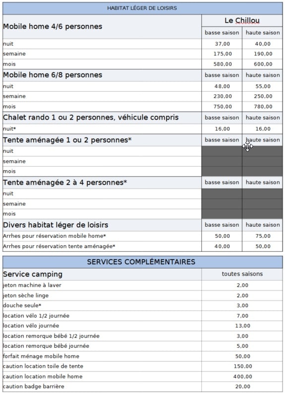 Dépôt de glace, Location de bungalow / HLL, Location de mobil home, Location de vélos/VTT, Nettoyage / ménage, Terrain fermé la nuit, Wifi