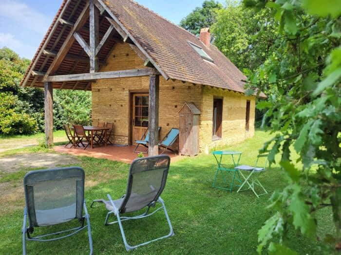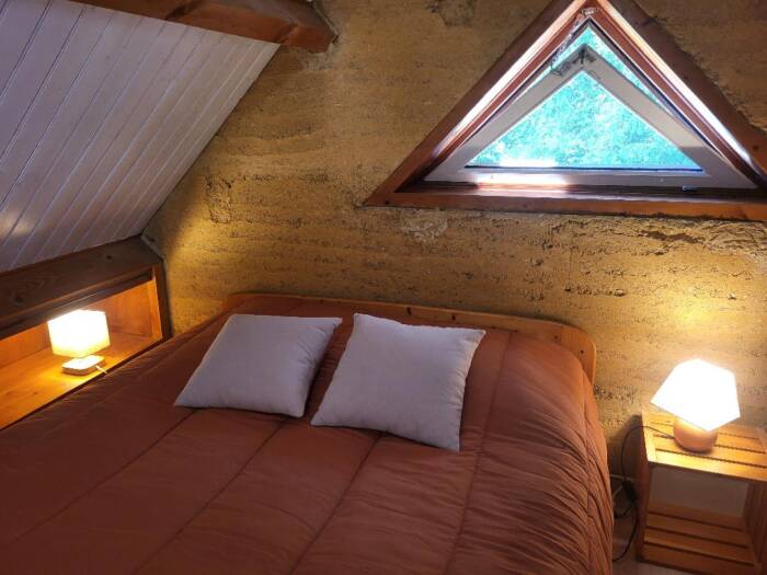 Ce gîte en pisé de type Acadien (35 m²) est bâti sur un terrain de 15 000 m² non clos comprenant également trois autres gîtes et un gîte de séjour. Au rez-de-chaussée se trouve la pièce de vie (séjour/cuisine avec insert), une petite chambre (2 lits superposés 90) et la salle d'eau avec wc. À l'étage : une chambre en mezzanine, ouverte sur la pièce de vie comprend un lit 140.